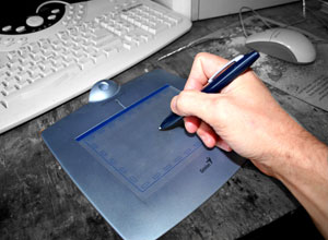 | Прилагаю фото планшета. Подключается к USB, ставятся "дрова", и при вытаскивании "авторучки" из гнезда и приближении её к полю планшета происходит автоматическое переключение с мыши на "авторучку", курсор начинает реагировать даже на некотором расстоянии пера от планшета, т.е можно "прицелится". При касании пером планшета перо полностью выполняет функцию мыши. Естественно, гораздо привычней рисовать пером, чем мышью, при этом планшет реагирует на степень нажатия на перо, и при рисовании кистью, карандашом, и другими инструментами Шопа -полная иллюзия, что рисуешь обыкновенной кистью, карандашом на обычной бумаге.(Прилагается еще программулька, при помощи которой можно писать текст на планшете, а программулька преобразует ваши каракули в обычный тестовый формат). Прямоугольнички по краям рабочего поля планшета- "горячие клавиши",устанавливаются пользователем, произвольно. Кстати, планшет и рука выделены с помощью этого-же планшета