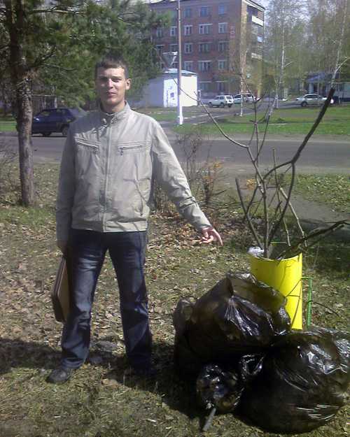 | Однако и со мной сегодня отстой приключилсо... Согнали мою группу мусор убирать, напротив 2й школы... из инструментов дали пакет для мусора, и !!!парекмахерскую перчатку!!!, а из грабель только ручные!!! Короче собирать пришлось практически голыми руками... Хорошо хоть основную часть мусора составляли прошлогодние листья, а не всякие там резиновые изделия номер два и тому подобное... Насобирав полных три пакету мусора, т.е. перевыполнив план втрое, я со своим одногрупником, свернул свою деятельность и отправился на остановку... На фото: мой одногрупник Санек и плоды, нашего с ним, труда